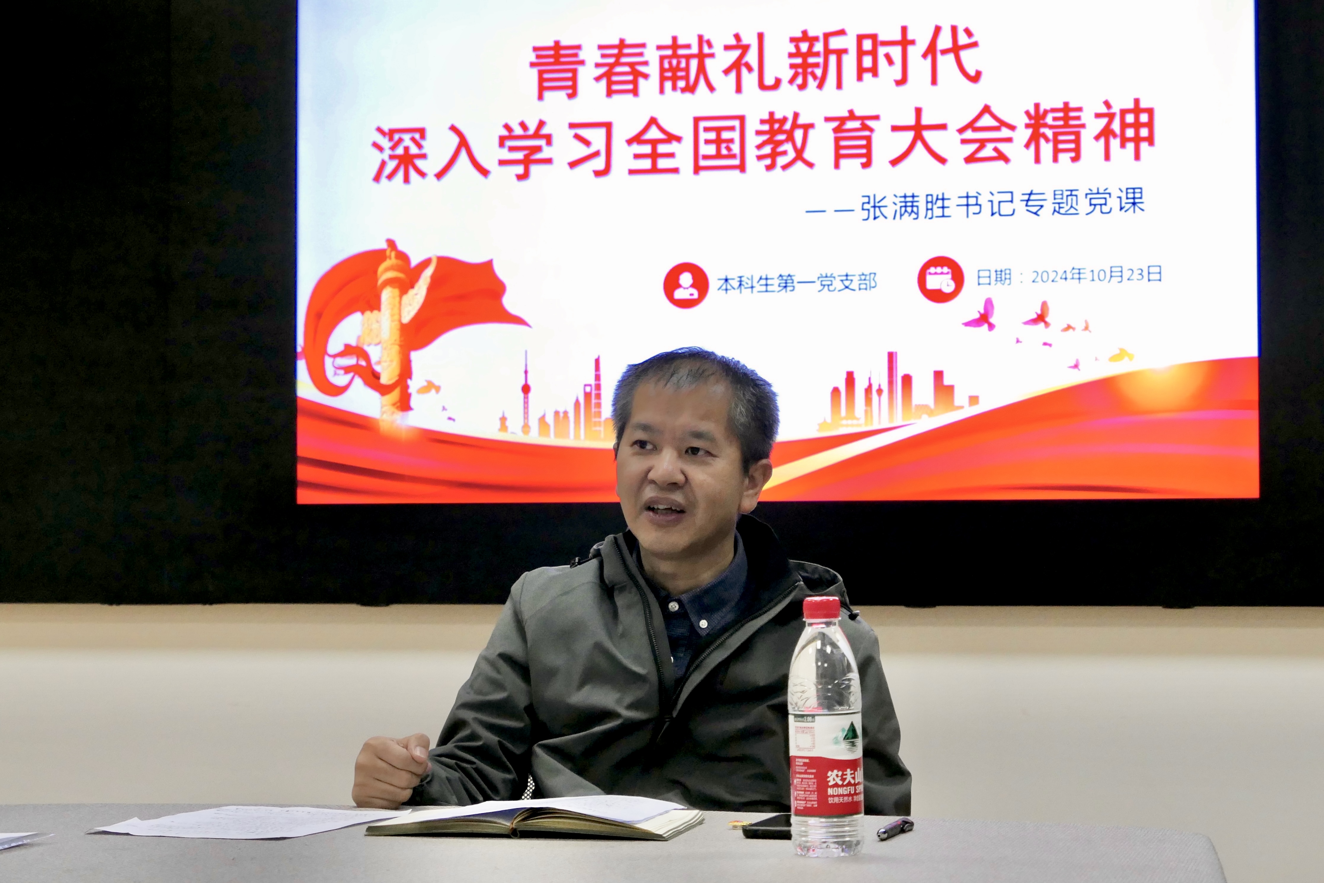 最后,张满胜书记对本科生第一党支部的学生党员提出深切期许,希望大家能够通过此次党课学有所成、学有所获、学有所得,鼓励党员同志在日常学习生活中勤勉刻苦、学以致用,务实功、出实招、求实效,用实际行动践行全国教育大会精神,为加快建设中国特色社会主义教育强国添砖加瓦。