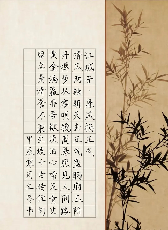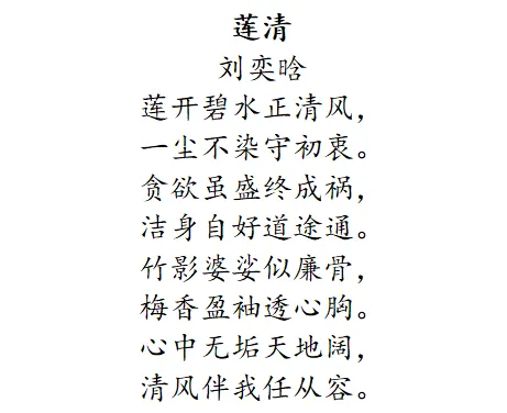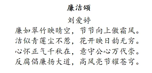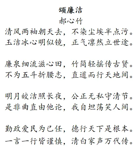 创作理念:这首诗以 “廉” 和 “洁” 为核心展开。首联将廉洁比作翠竹,象征廉洁之人刚正不阿、高风亮节的品质。颔联把廉洁形容成青莲,寓意廉洁之人在复杂环境中能保持自身纯净。颈联指出心怀正气与坚守公心的廉洁精神会千古流传。尾联强调反腐倡廉是人间正道,呼唤人们秉持廉洁的价值观念。