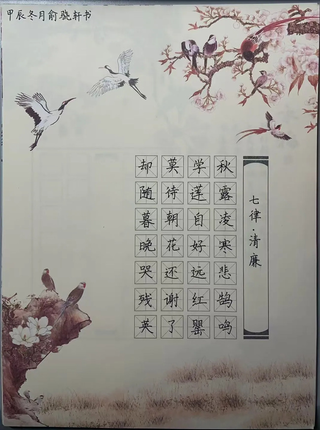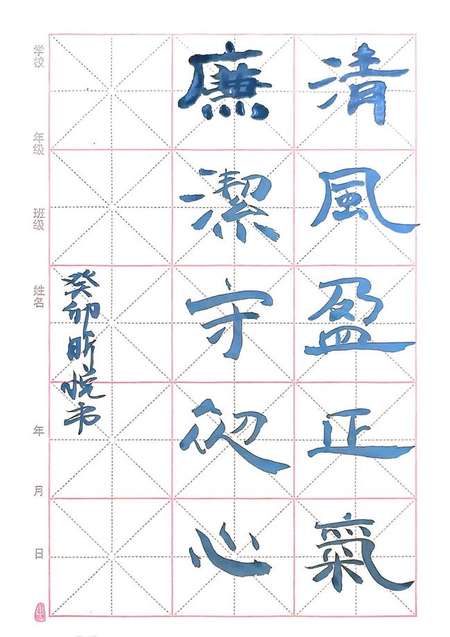 创作理念:本作品为《七律·清廉》(节选)的硬笔书法,充分地体现了作者即使身在淤泥之中依旧两袖清风的廉洁理念。作为共产主义的接班人,我们应当接过时代的接力棒,让廉洁在我们的时代里继续熠熠生辉、焕发光彩。