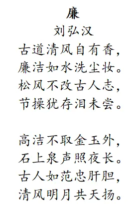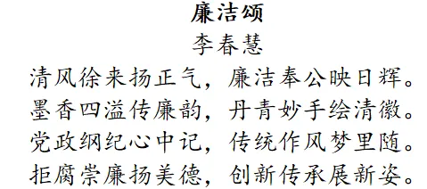 创作理念:此诗以“廉洁”为主题,通过描绘清风正气、墨香丹青等元素,展现了廉洁文化的深厚底蕴和鲜明特色。诗中“清风徐来”象征着廉洁之风的吹拂,“墨香四溢”则寓意着廉洁文化的传承与创新。整首诗呼吁人们拒腐崇廉,传承美德,共同营造清风正气的社会氛围。