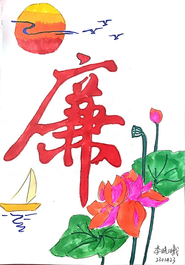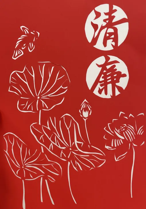 创作理念:本绘画作品以荷花为核心主题,通过刻刀在纸上勾勒出荷花在水中的优雅姿态,通过以莲示廉、借莲倡廉,将刻纸传统艺术与莲花的结合,不仅将“清廉”刻在纸上,更希望刻在每个人的心中,使大家明悟廉洁之重要,激发对莲花的爱护之情,坚守廉洁之德!