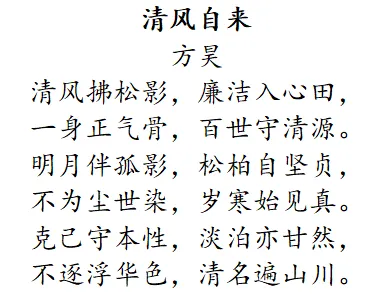 创作理念:本诗以“清风”喻廉洁,赞颂廉洁文化之美德。“清风拂松影,廉洁入心田”表达了廉洁如清风般的清新,在心中激荡出正直之情。“一身正气骨,百世守清源”突出了廉洁品质的代代相传。通过这些意象和寓意,诗歌传达了廉洁的坚韧与恒久,呼吁人们传承这种美德,营造出“清风正气”的良好社会氛围。
