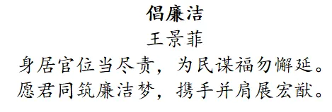 创作理念:《倡廉洁》一诗,传达了廉洁奉公的高尚情操。首句强调了官员应恪尽职守,不负人民重托。次句则进一步指出官员的责任在于为民造福,且不可有丝毫懈怠。后两句则表达了对廉洁社会的向往,并呼吁大家共同努力,携手并进,共同开创美好的未来。