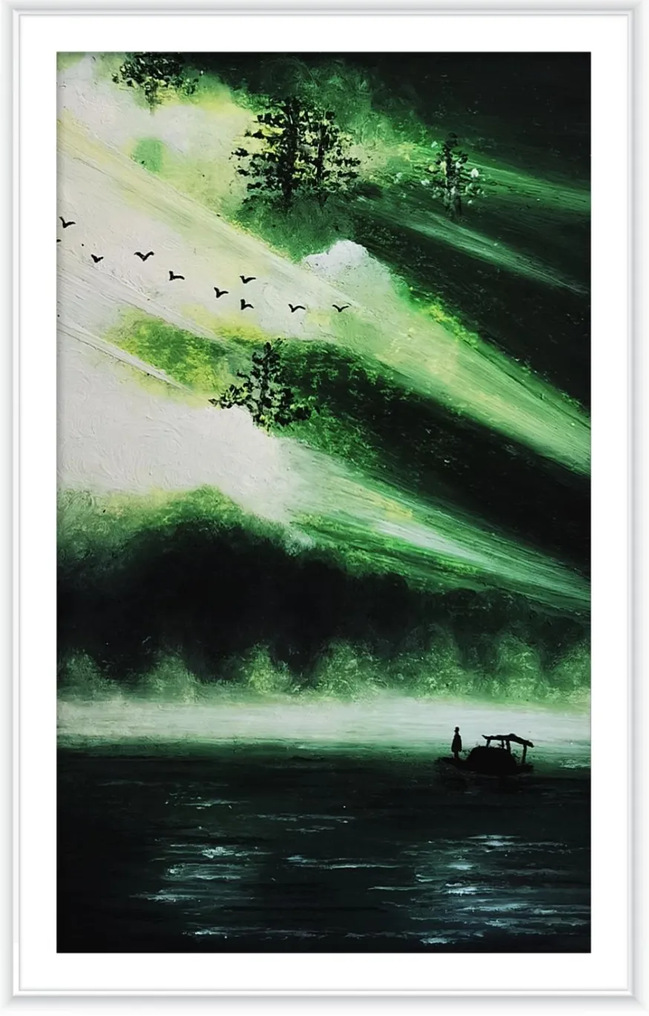 创作理念:破晓之光,穿透了黑暗,映照出画面的底色——绿色,恰似廉洁之色的本质,清澈而熠熠生辉。湖面之上,一叶扁舟悠然漂浮,舟上人影静谧,这是清廉自持、淡泊名利的生动写照。苍穹之间,群鸟振翅,自由翱翔,它们如同廉洁精神的使者,不受贪婪与腐败的丝毫沾染,展现着廉洁之魂的圣洁与高远。