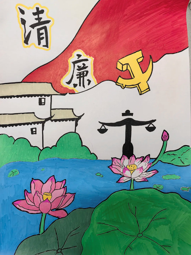 创作理念:本绘画作品以荷花与党徽为主题进行创作,以马克笔为工具勾勒出荷花在水中的美好形象。自古以来,清正廉洁便是中华民族崇尚的美德。身为新青年的我们,应接过时代的接力棒,让廉洁在我们的时代里依旧熠熠生辉。