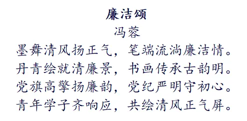 创作理念:此诗以“廉洁”为主题,通过书画艺术的描绘,展现了廉洁文化的深厚底蕴和时代价值。首句寓意着廉洁之风的传播和正能量的弘扬。次句则传递出对廉洁文化的热爱和追求。后两句则强调了党纪严明和青年学子的积极响应,共同绘制清风正气的美好图景。
