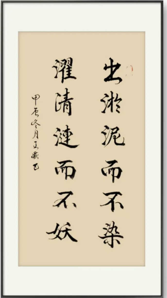 创作理念:这幅书法作品选取了周敦颐《爱莲说》中的经典句子“出淤泥而不染,濯清涟而不妖”。这句诗不仅是对古代文人清廉节操的礼赞,更是对当今社会中廉洁自守、抵制腐化的价值观的呼吁,鼓励人们在面对诱惑和污浊时保持内心的纯净和正直,激励人们在世俗中保持清明之心。