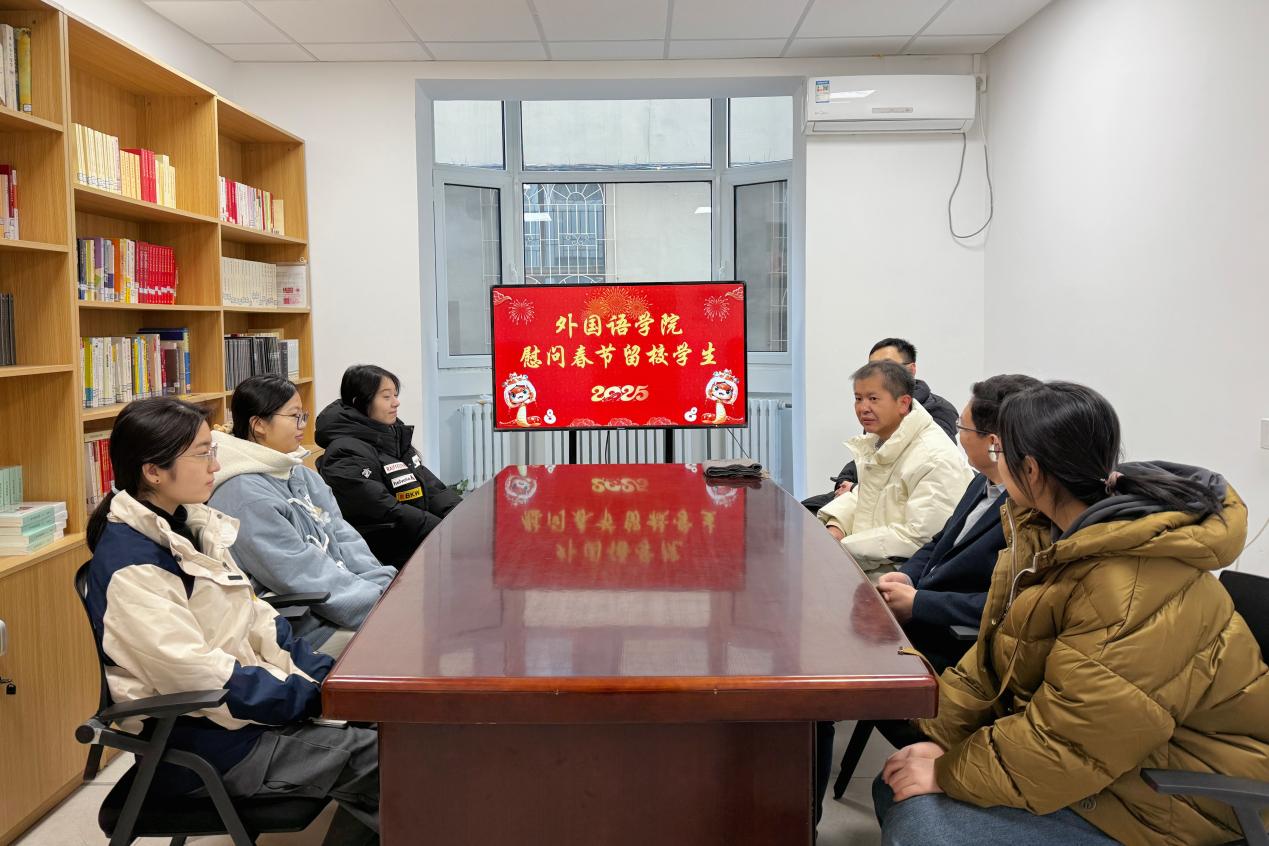 党委书记张满胜,党委副书记、副院长(兼)严志刚以及相关辅导员在五舍121室慰问相关留校学生,向学生们致以新春问候和节日祝福。